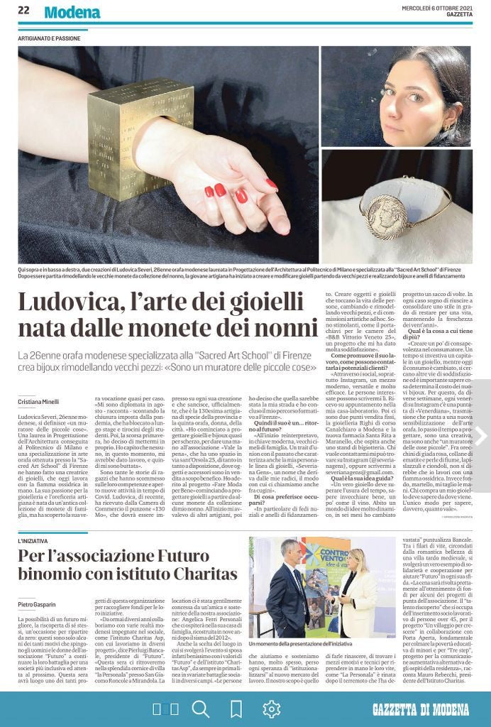 "Modena. Ludovica, l’arte dei gioielli nata dalle monete dei nonni. La 26enne orafa modenese specializzata alla “Sacred Art School” di Firenze crea bijoux rimodellando vecchi pezzi: «Sono un muratore delle piccole cose»..."